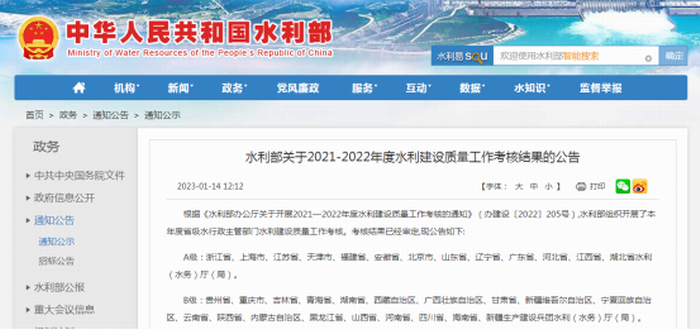 1月14日,水利部发布公告,通报了2021-2022年度全国水利建设质量工作考核结果。我省为A级,排名全国第五,较上年度再前进一名,为历年最好成绩。