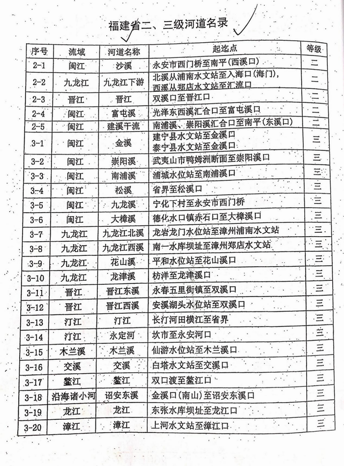 根据海角论坛 《关于印发<福建省二三级河道名录>的通知》《关于印发<福建省四级河道名录(首批认定)>的通知》,我省二、三、四级河道名录如下。除一二三四级河道外的其他河道为五级河道。